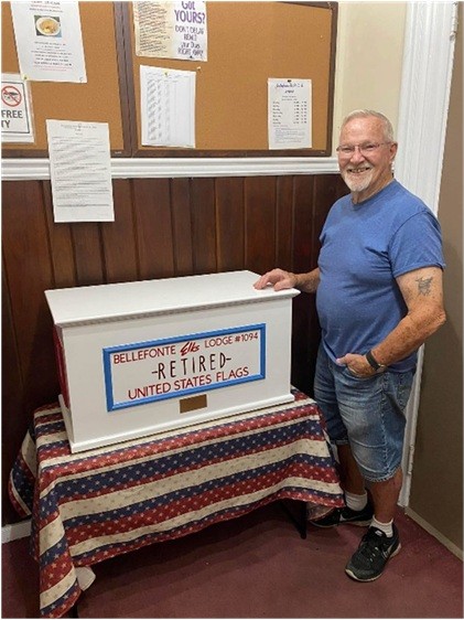 The box was custom made by one of our members, George “Whitey” Noll.  It was painted by another member, Stephanie Grove.  Thank you to both Whitey and Stephanie!  This box represents the Elks Patriotism, and ensures that the flags get disposed of properly.  At the Flag Day Ceremony in June, the Pleasant Gap Legion performs a flag burning ceremony and also takes the remaining flags to be disposed of properly.