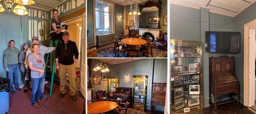 Many of you know this room as “Tiger’s Room”. Tiger was an Elks member who has since passed away. Tiger would go into this room to read his newspaper and enjoy his cold beverage. This room has a lot of character, and Lodges were to have a “Heritage Room” to display the history of the Elks and their Lodge. Beth Crist had a vision, to transfer this room into that room, a place to showcase the pictures and memorabilia of our Lodge. The Bellefonte Elks received its charter in 1907, and acquired their current building in 1908.  The building was the former home of Governor Andrew Curtain, who was the Civil War Governor from 1861-1867.  He was the 15th Governor of Pennsylvania and he was one of seven Governors that came from Bellefonte.  The building has gone through a lot of changes since it was acquired in 1908, with this being the most recent renovation. Beth, along with a few members, added a fresh coat of paint to the walls, new lighting, new curtains and carpet, and added a few items that have historical meaning, one being a roll top desk. Some say this desk belonged to Governor Curtain. An old parade uniform was added to the room along with a few items of memorabilia history that are displayed in the glass cabinets. A plaque displaying the memory of Tiger sits on the mantel. A table and chairs occupy the room along with some wing back chairs, complements of members Scott McKee and Kim Chambers, a few high top tables and chairs, and a brand new television donated by members Keith Rupert and Angela Packer.  The room is very warm and welcoming and thanks to Beth’s vision, we have a beautiful room to enjoy!